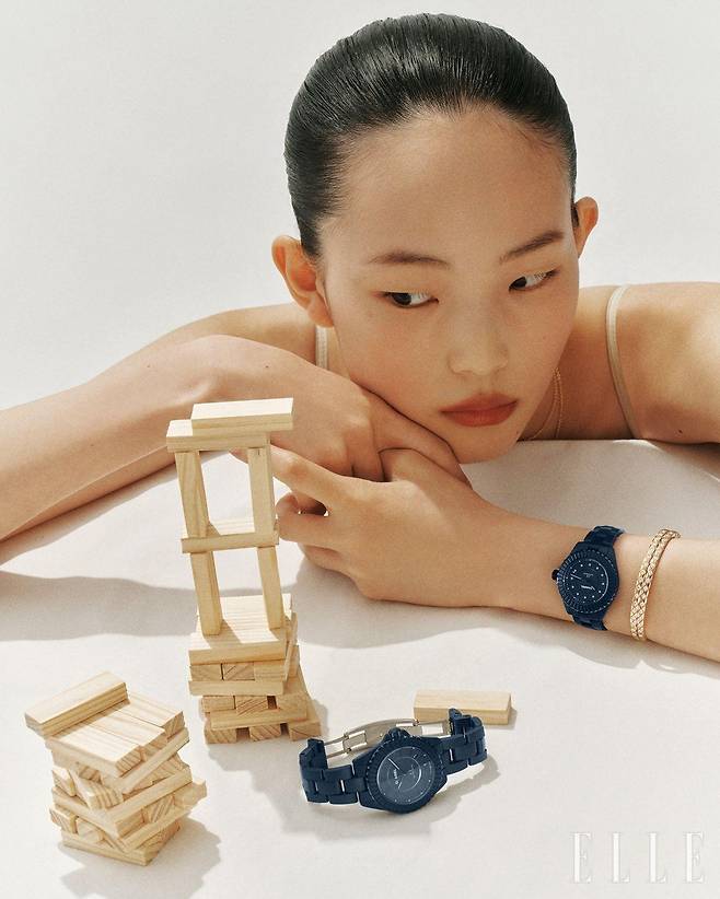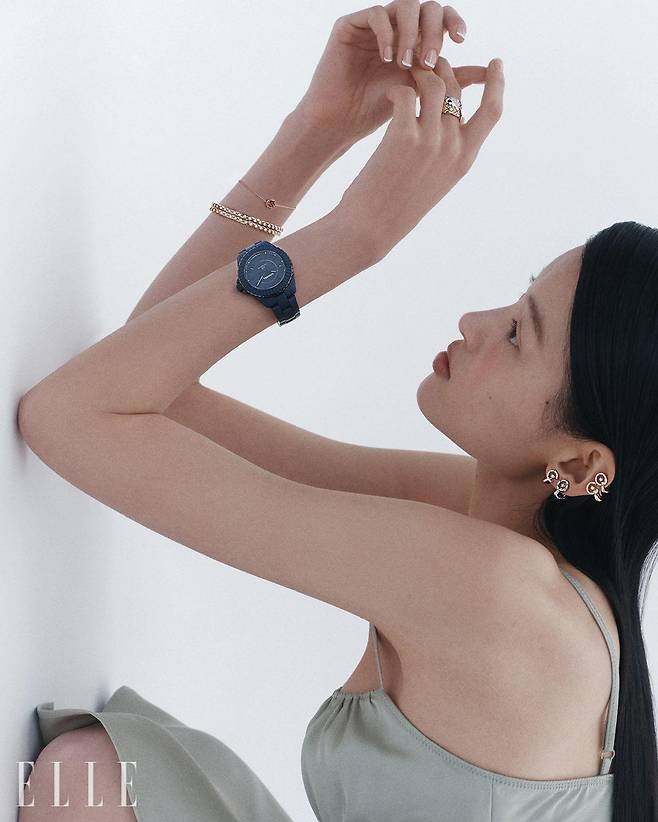 윤서가 착용한 인덱스에 브릴리언트 컷 다이아몬드를 세팅한 J12 블루 칼리버 12.2 33mm 워치, 베이지골드 코코 크러쉬 네크리스, 옐로골드 코코 크러쉬 네크리스, 퀼팅 모티프에 다이아몬드를 세팅한 옐로골드 코코 크러쉬 미니 브레이슬릿, 베이지골드에 다이아몬드를 세팅한 코코 크러쉬 미니 브레이슬릿, 바닥에 있는 매트 블루 세라믹과 블랙 코팅 스틸 케이스의 리미티드 에디션 J12 블루 칼리버 12.1 38mm 워치는 모두 Chanel Watches & Fine Jewelry.