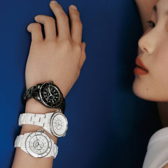 블랙 세라믹과 스틸 케이스가 조화를 이룬 J12 워치 칼리버 12.2 33mm, 베젤과 다이얼에 다이아몬드를 세팅한 화이트 세라믹 케이스의 J12 다이아몬드 베젤 워치 칼리버 12.2 33mm, 화이트 세라믹 케이스의 J12 워치 칼리버 12.2 33mm는 모두 Chanel Watches.