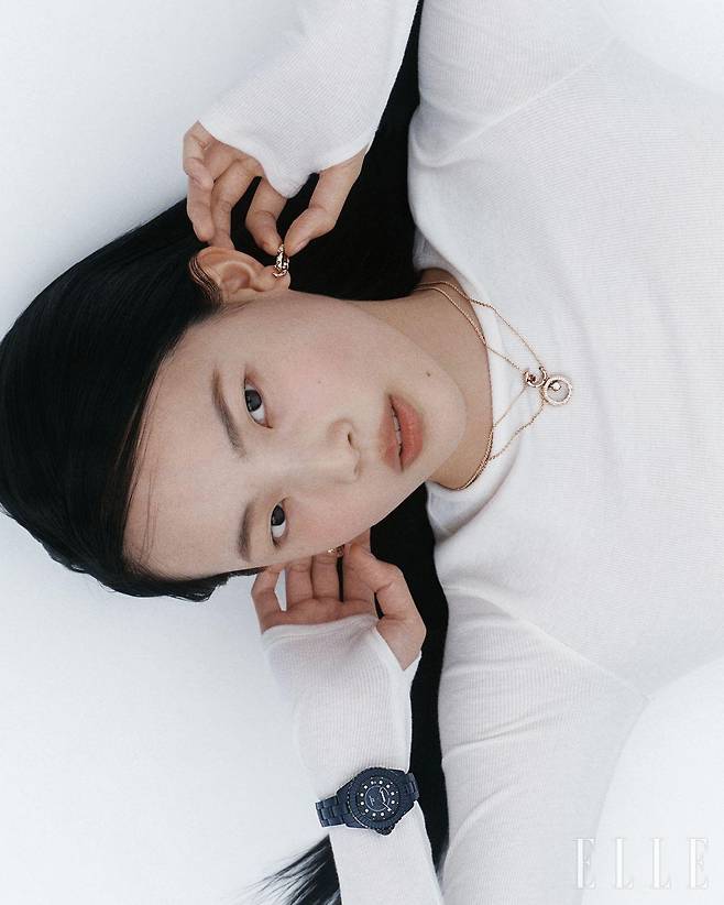 윤서가 착용한 화이트 마더 오브 펄 다이얼에 다이아몬드 세팅 인덱스가 특징인 J12 워치 칼리버 12.2 33mm 워치, 각각 알파벳 C와 O 모티프의 코코 크러쉬 싱글 이어링은 모두 Chanel Watches & Fine Jewelry. 자기가 착용한 블랙 세라믹과 스틸 케이스가 조화를 이룬 J12 워치 칼리버 12.2 33mm, 퀼팅 모티프를 따라 다이아몬드를 세팅한 베이지골드 코코 크러쉬 싱글 이어링, 화이트골드에 다이아몬드를 세팅한 코코 크러쉬 싱글 이어링, 화이트골드 코코 크러쉬 스몰링, 링 모양 펜던트 코코 크러쉬 네크리스는 모두 Chanel Watches & Fine Jewelry.