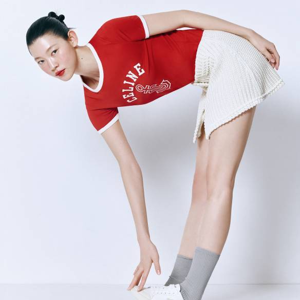 티셔츠 99만원, 코듀로이 미니스커트 가격미정, 스니커즈 1백5만원 모두 Celine by Hedi Slimane. 양말 에디터 소장품.