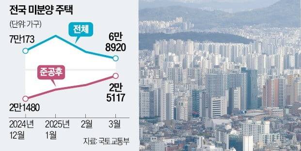 국토교통부 통계에 따르면 3월 말 기준 전국 미분양 주택은 6만8920가구. 이 중 준공 후 미분양 주택은 2만5117가구다. 한 달 전에 비해 5.9% 늘면서 11년 7개월 만에 최고치를 기록했다.