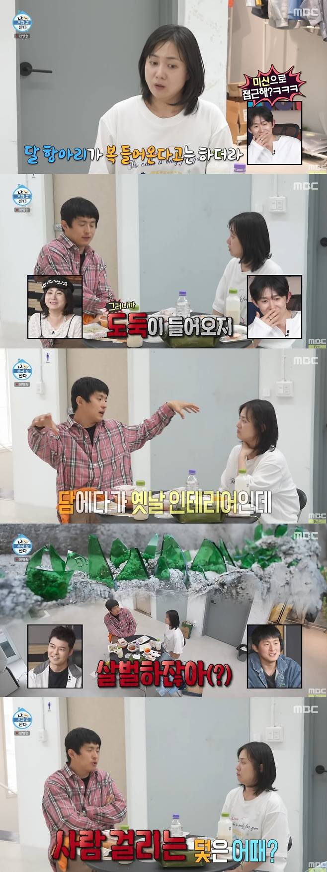 생각에 잠긴 기안84는 "너 집 대문에 유리나 거울 있니. 터가 너랑 안 맞나"라고 걱정했고, 박나래는 "터는 좋다더라. 난 문 앞에 달항아리도 뒀다. 난 (복) 들어올 수 있는 건 다 해놨다"며 미신으로 답했다.