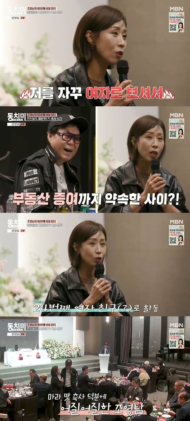 매워지는 축사에 정선희도 등장했다. 정선희는 "조영남을 피해 온 세월이 있다. 절 자꾸 여자로 보신다. 은밀히 24번째 여자친구로 (살았다)"며 "부동산 일부도 저에게 증여 하겠다는 약속도 해주셨다"고 폭로해 웃음을 안겼다.