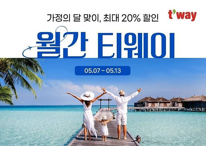 티웨이항공 관계자는 “가정의 달 5월을 맞이하여 가족과 여행을 계획하는 분들을 위한 최대 할인 혜택을 준비했다”며 “티웨이항공을 이용하는 고객들이 항상 행복한 여정이 될 수 있도록 안전운항에 최선을 다하겠다”고 전했다.
