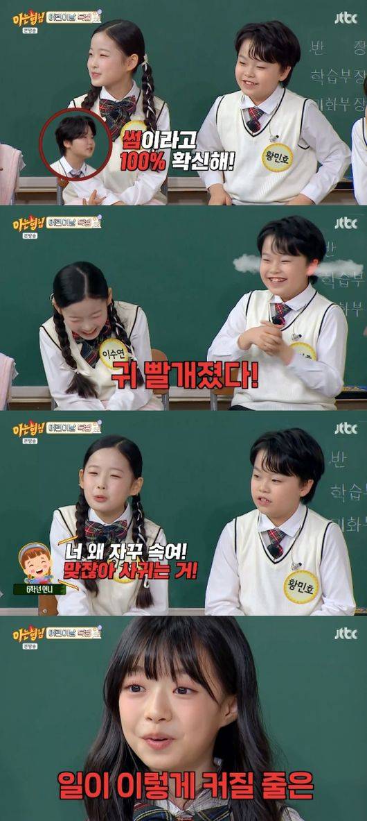이수연은 “기분이 나쁘진 않다. 나랑 친한 6학년 언니가 있는데 DM으로 연락이 왔다. 민호 오빠랑 사귀냐고. 말하는 분위기가 다르다고 하더라. 왜 자꾸 속이냐고 한다”라고 덧붙였다.