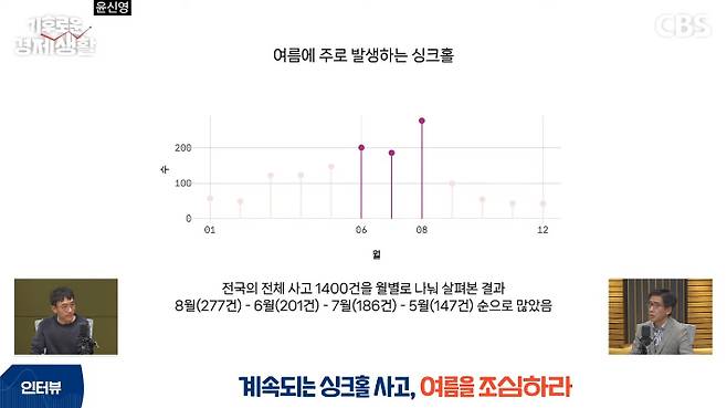 ◆ 홍종호> 그러니까 그 얘기는 여름에 싱크홀이 확실히 많이 발생한다, 이런 말씀이시죠? 그 얘기는 여름의 날씨와 관련되는 거네요.