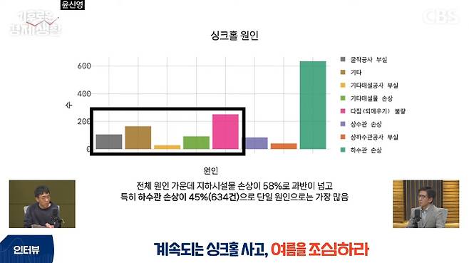 ◇ 윤신영> 네. 여름철 발생을 늘리는 주 요인을 제가 원인별로 쭉 보니까, 전체 원인의 한 45%를 차지하는 게 결국은 하수관 손상이에요. 하수관이 파손되면서 물이 새고 그것이 지반을 약화시키고 이런 패턴들이 계속 반복이 되고 있는데 전체의 거의 절반이 되기 때문에 이것이 계절성을 나타내는 주요인이더라고요. 공사는 겨울에도 할 수도 있잖아요. 하수관 손상에 의한 싱크홀은 거의 여름에 집중이 되고요.
