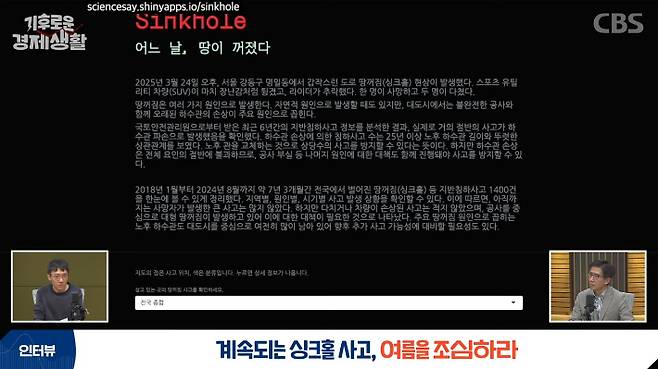 ◇ 윤신영> 약간 어리둥절하기도 해요. 제가 처음 이 지도를 만든 거는 지난해 여름이었어요. 사실 싱크홀은 계속 있었는데 당시 서울 연희동에서 싱크홀 사고가 났을 때 워낙 오랜만에 주목을 받아서 찾아보다 보니까 자료가 너무 없길래 만들었거든요. 지리적으로 정보가 표시가 되면 시민들한테도 도움이 되고 또 정책 세울 때도 도움이 될 것 같아서 찾아봤는데 없어서 직접 만들었는데요. 사실 처음 알아봐 주신 게 이 <기후로운 경제생활> 프로그램이었어요. 그때 등장하고 그 이후에 더 알려져 가지고 지금에 이르렀습니다. 사실 정부가 지금 많이 뭇매를 맞고 있는 게 데이터를 잘 공개하지 않아서잖아요.