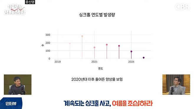 ◇ 윤신영> 네 한 2020년대 이후로는 그전에는 한 연간 200건 이상 기록이 돼 있는데 최근 한 5년 사이에서는 한 연간 100건 내외에서 왔다 갔다 하는 수준으로 조금 줄어들어 있습니다. 물론 데이터상의 기록이니까 여기에 기록되지 않은 다른 싱크홀들도 있을 가능성도 있는데요. 적어도 최근에 갑자기 이렇게 증가한 건 아니고 관심도가 높아져서 자주 접하게 된 것 같습니다.