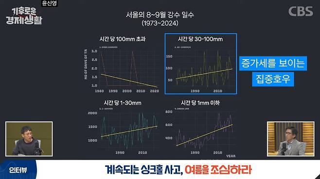 ◇ 윤신영> 예. 비가 많이 오고 또 보통 뚜렷한 하나의 기준은 없지만 한 1시간에 30ml 정도의 비가 오면 보통 집중호우로 많이 분류를 해요. 이게 정확한 공식 기록은 아닙니다만 그 정도로 많이 굉장히 세차게 비가 오는 걸 묘사하는데요. 장대비라고 흔히 얘기하는 근데 요 확률만 따로 날수만 따로 비교를 해봐도 최근에 뚜렷하게 증가하는 경향을 보이고 있어요. 그래서 전반적으로 비가 많이 내린다기보다는 강한 비가 내리는 횟수가 굉장히 늘고 있고 빈도가 늘고 있어 가지고 앞으로 아마 하수관을 포함해서 많은 인프라들이 여기에 대한 대책을 좀 세워야 될 거로 예측할 수 있습니다.