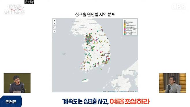 ◇ 윤신영> 그거는 아마 그걸 지금 공개 안 하고 있어서 서울시가 지금 안타까운 건데 그냥 지도만 보면 사실 굉장히 산재해 있어요. 산재해 있어요. 어느 곳이라고 딱 따아 말할 수 없을 정도로 많이 있고요. 그냥 힌트가 좀 될 만한 거는 보면 하수관에 의한 손상 같은 경우는 확실히 도로를 따라서 많이 형성이 돼요. 아마 관거를 따라서 형성되다 보니까 그런 건데 집중되는 곳들이 아무래도 위험한 곳이니까 그런 분들 우선순위를 좀 둘 수 있지 않을까 생각합니다.