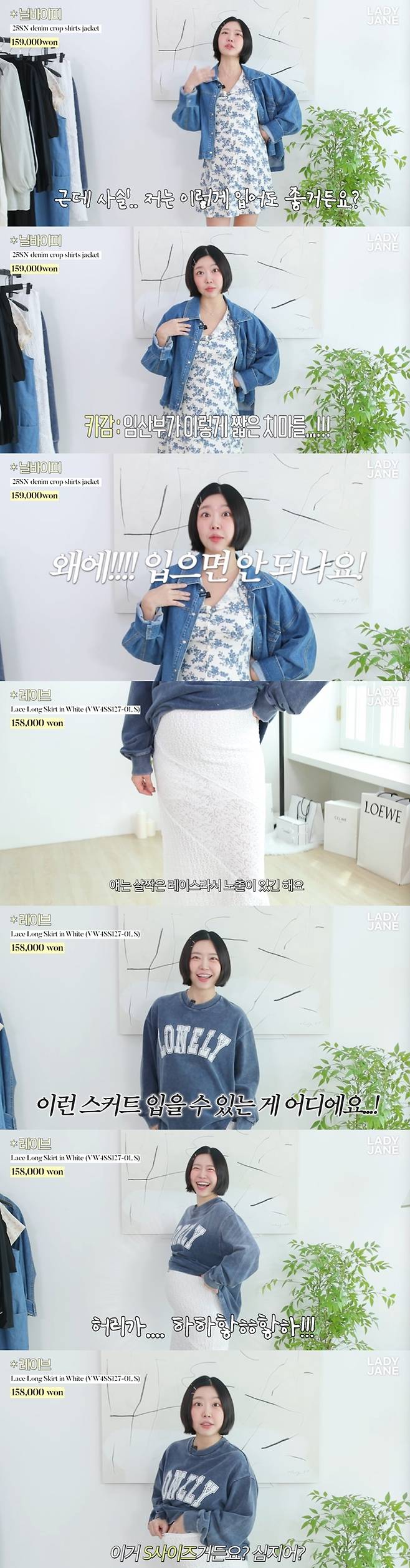 두 번째 룩은 맨투맨에 롱 스커트를 매치한 패션. 레이디제인은 "롱 스커트 입지 않나. 살짝 레이스라 노출이 있긴 하다. 안감이 짧다. 근데 임산부가 이런 거 입을 수 있는 게 어디냐"며 숨겨놓은 배를 공개했다.