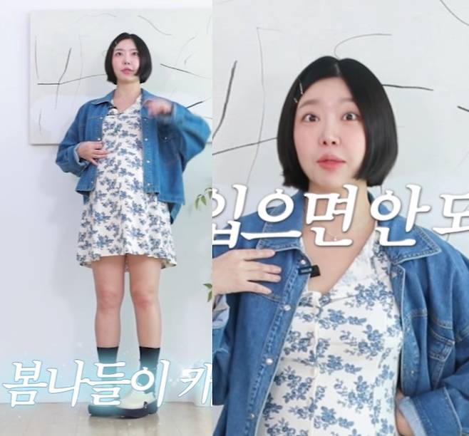 첫 번째 룩으로 미니 원피스를 입은 레이디제인은 "신축성이 있다. 배가 나온 건 보이지만 소재가 얇은 코튼 소재라 부드럽고 가볍다"고 이야기했다.