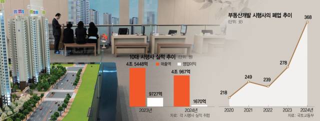 4일서울경제의 취재를 종합하면 10대 시행사의 지난해 총매출은 4조 967억 원으로 전년(4조 5448억 원)보다 10.8% 줄었다. 지난해 총 영업이익은 1670억 원으로 2023년(9727억 원)보다 82.9% 감소했다. 매출 기준 업계의 1, 2위인 DS네트웍스와 엠디엠은 미분양 여파로 실적이 감소했다. DS네트웍스의 경우 매출은 7450억 원으로 전년 8184억 원 대비 9% 감소했다. 영업손실이 1603억 원으로 적자 전환했다. 매출이 악화한 이유는 지방 부동산 경기 악화로 분양률이 저조했기 때문이다. 대구 감상동 주상복합 분양률은 절반을 겨우 넘긴 51.15%에 그쳤고, 서울 길동SK주상복합 역시 분양률이 예상보다 낮은 82.16%에 머물렀다. 엠디엠도 상황이 다르지 않다. 지난해 별도 기준 매출액은 3113억 원으로 2023년(8815억 원)보다 64.7% 감소했다. 영업이익은 4721억 원에서 1227억 원으로 급감했다. 경기 주요지역에서 분양 미수금이 발생한 영향이 크게 작용한 것으로 풀이된다. 파주 운정푸르지오 파크라인은 분양 완료를 위해 할인분양을 하는 상황이다. 다만, 엠디엠 계열사인 엠디엠플러스는 지난해 매출(6501억 원)과 영업이익(1543억 원)이 전년보다 각각 48.7%와 67.5% 증가했다.