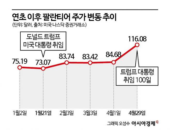 CNBC에 따르면 도널드 트럼프 대통령이 취임한 1월20일부터 취임 100일이었던 4월29일까지 기간동안 미국 주식 중 가장 높은 수익률을 기록한 종목은 팔란티어인 것으로 조사됐다. 해당 기간 동안 팔란티어의 주가는 73.07달러에서 116.08달러로 58.8% 급등했다. 트럼프 대통령의 관세전쟁 여파로 미국 주식시장 종목 대부분이 모두 급락세를 면치 못하는 상황에서 홀로 강세를 유지한 것이다.
