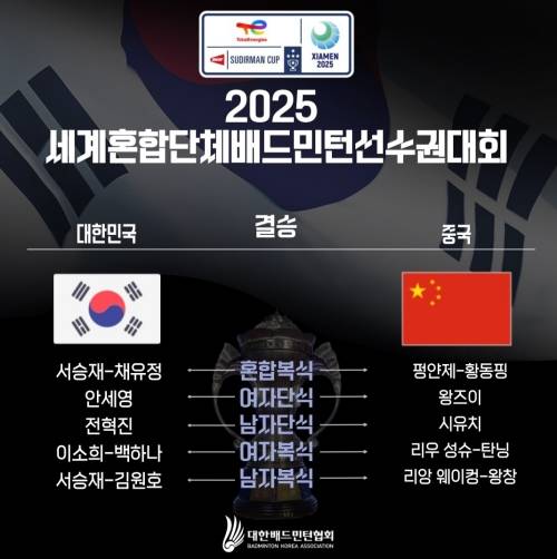 혼합복식의 서승재-채유정이 세계 1위 정쓰웨이-황야충, 남자단식의 이윤규가 시유치한테 각각 패배하면서 위기에 몰렸고, 믿었던 안세영마저 여자단식에서 천위페이한테 지면서 승부는 싱겁게 끝났습니다.