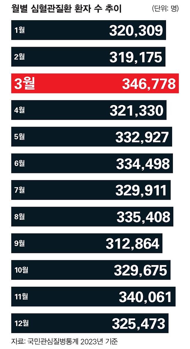 심혈관질환은 흔히 기온과 체온이 떨어지는 겨울에 많이 발생할 것 같지만, 사실은 그렇지 않다. 국민관심질병통계에 따르면, 2023년 심혈관질환으로 진단받은 총 130만 명 중 가장 많은 34만6778명이 3월에 발생했다. 가장 적게 발생한 9월(31만2864명)과 비교해 약 3만3000명 이상 차이를 보였다.