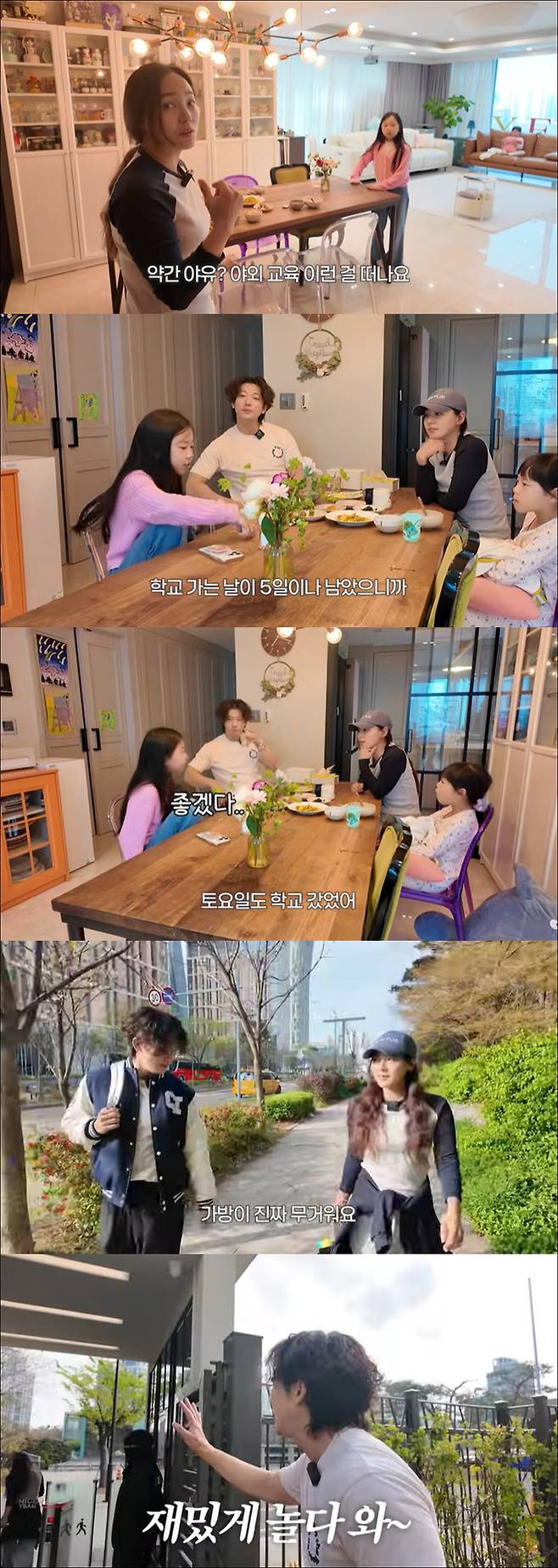 정신 없이 등교 준비를 마친 후 아이들과 함께 등교를 하는 기태영 유진 부부. 부부는 캐리어 가방과 백팩을 하나씩 들었다. 유진은 "가방이 진짜 무겁다. 든 거는 별거 없다. 맥북이 들어있고 도시락이 들어있는 게 다다. 근데 그게 무겁다"고 말했고 기태영은 "요즘은 교과서가 없다"고 밝혔다.