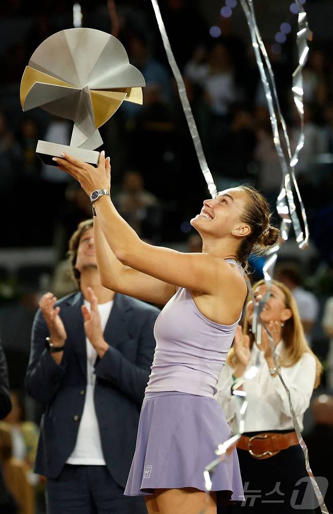 (마드리드 AFP=뉴스1) 우동명 기자 = 벨라루스의 아리나 사발렌카가 3일(현지시간) 스페인 마드리드에서 열린 여자프로테니스(WTA) 투어 무투아 마드리드 오픈 결승서 미국의 코코 고프를 꺾은 뒤 우승 트로피를 들고 기뻐하고 있다. 2025.05.04