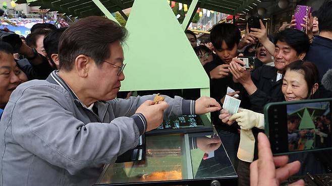▲ 더불어민주당 이재명 대선 후보가 '골목골목 경청투어' 사흘째인 3일 강원도 태백시 장성동 산나물 축제장에서 붕어빵을 사먹으며 지역화폐를 사용하고 있다.