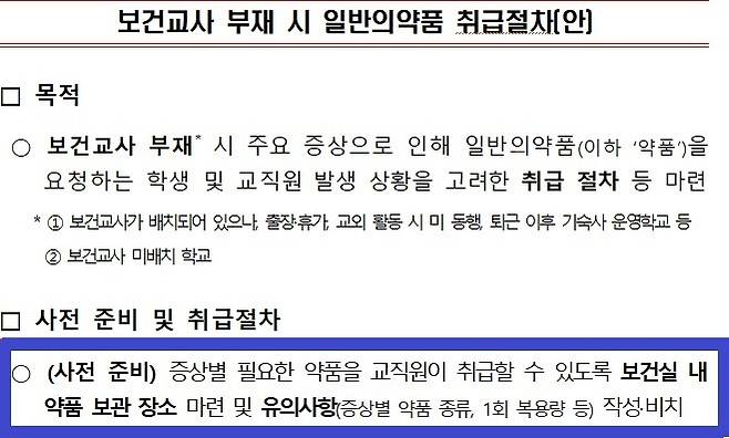 | ▲ 교육부가 시도교육청에 보낸 보건교사 부재 시 일반의약품 취급절차 |