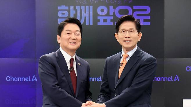 ▲ 24일 서울 종로구 동아미디어센터 채널A 스튜디오에서 국민의힘 대선 2차 경선 진출자인 안철수(왼쪽), 김문수 후보가 토론 전 악수를 하고 있다.