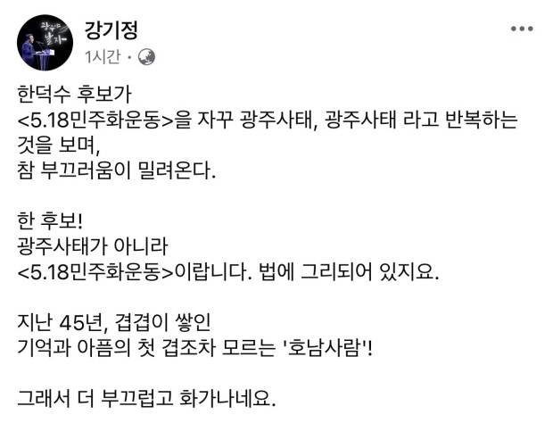 이에 강기정 광주시장은 개인 페이스북에 한 전 총리에 대해 “45년 겹겹이 쌓인 기억과 아픔의 첫 겹조차 모르는 호남사람”이라고 비판의 글을 올렸다.