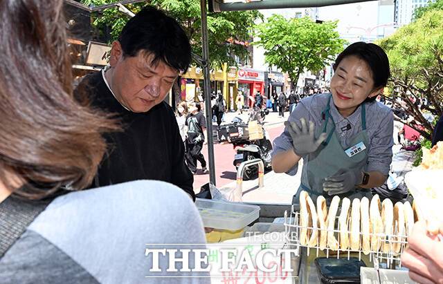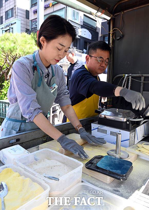 [더팩트ㅣ임영무 기자] 김재연 진보당 대선 후보가 4일 오후 서울 홍대입구역 인근의 호떡 노점을 찾아 직접 구운 호떡을 판매하고 있다.