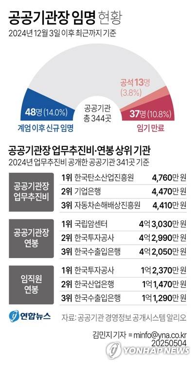 (서울=연합뉴스) 김민지 기자 = 4일 연합뉴스가 공공기관 경영정보 공개시스템(알리오) 공시를 전수조사한 결과 지난해 12월 3일부터 최근까지 새로 임명된 공공기관장은 전체(344개)의 14.0%인 48명으로 집계됐다.