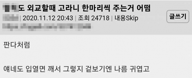 "우리도 고라니 외교를 하자." 몇 년 전부터 온라인 커뮤니티와 사회관계망서비스(SNS) 등에서 나오고 있는 제안이다. 중국이 멸종위기종인 판다를 타국에 임대하며 외교적 유대감을 강화하는 판다 외교 전략을 사용하는 것처럼 한국에 널리 분포한 고라니를 이용하자는 우스갯소리다. 한국에서 개체 수 과잉으로 유해 동물로 지정돼 있는 고라니는 전 세계적으로 개체 보호가 필요한 멸종위기종이다.
