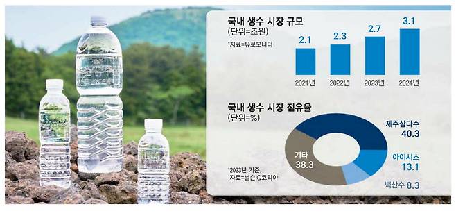 향후 국내 생수 시장을 둘러싼 경쟁은 더욱 물이 오를 전망이다. 닐슨IQ코리아가 집계한 2023년 국내 오프라인 생수 소매 시장 점유율은 제주삼다수가 40.3%로 독보적인 1위다. 이어 아이시스가 13.1%, 백산수가 8.3%를 차지했다. 올해 4월 환경부 자료 기준 국내 먹는샘물 제조 업체는 59개에 달한다.