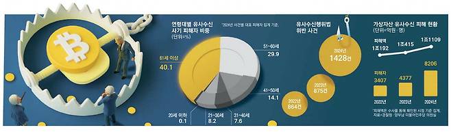 가상자산 투자를 빙자한 유사수신 사기단이 노인들을 유혹한 문구들이다. 이 같은 사기 사건이 최근 1년 새 60% 이상 급증했는데, 피해자 10명 중 4명은 환갑을 넘은 고령자였다. 고령층의 '노후 불안'이 가상자산 시장 활황에 따른 '대박 유혹'과 맞물리며 가상자산 투자 빙자 사기가 독버섯처럼 번지고 있는 것이다. 5월 가정의달을 어둡게 하는 단면이다.