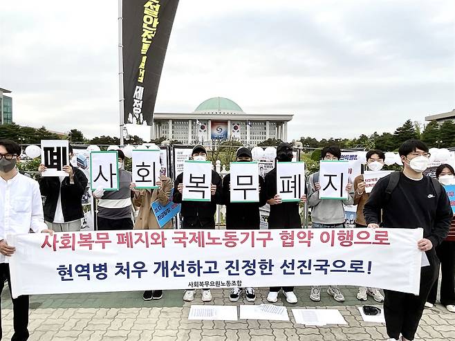 | ▲ 지난 2022년, 사회복무요원 노동조합이 국회 앞에서 사회복무제도 폐지를 요구하는 기자회견을 열었다. |