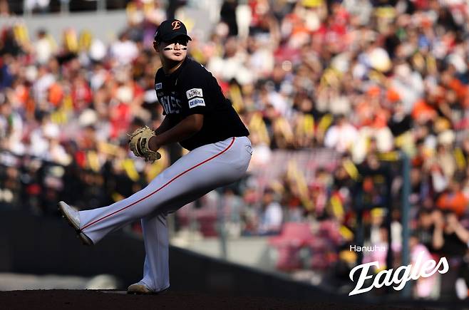 3회초는 최재훈이 체인지업, 황영묵이 슬라이더, 안치홍이 직구에 헛스윙 삼진을 당하며 K-K-K로 끝났다. 4회초에는 몸에 맞는 공으로 출루했던 문현빈이 늦은 귀루로 허무하게 견제 아웃되기도 했다. 문현빈은 4회말 수비가 시작되며 플로리얼과 교체됐다.