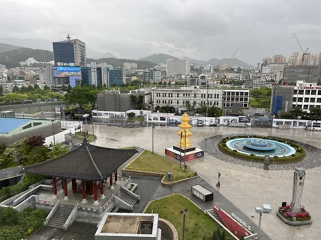 | ▲ 245개 헬기탄흔이 발견된 전일빌딩에서 내려다 본 민주광장 전경. 위로 내외부 공사 중인 옛 전남도청이 보이고, 왼편 파란 지붕의 건물은 당시 시신을 임시 안치했던 상무관이다. 당시의 모습 그대로인 중앙의 분수대 아래로, 2013년 다시 가져다 세운 시계탑이 보인다. 시계탑 아래 스피커를 통해 매일 오후 5시 18분이면 어김없이 '임을 위한 행진곡'이 흘러나온다. |