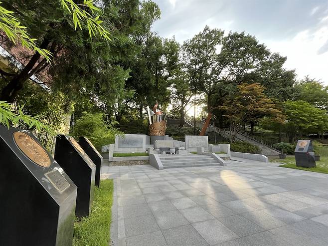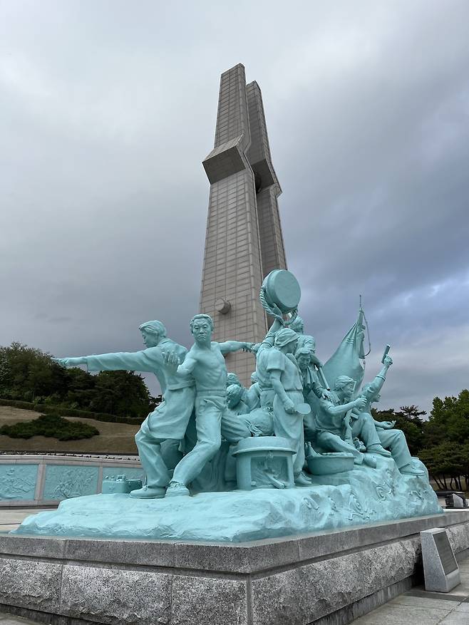 | ▲ 광주공원에 세워진 4.19혁명 기념탑 전경. 양 옆으로 당시 희생된 학생 7명의 부조상이 서 있다. 광주는 5.18의 도시이자, 4.19혁명의 성지이기도 하다. 기념탑 앞 주차장으로 쓰이는 너른 공간은 5.18 당시 시민군의 훈련장으로 활용되었다. |