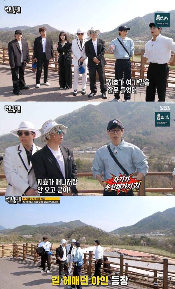 유재석은 "지효가 여기 길을 잘못 들었다고 하더라. 이 근처에서 헤매고 있다"고 설명했다.