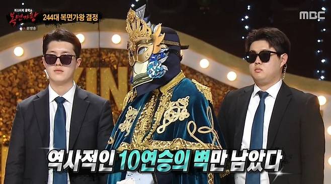 이후 244대 가왕전이 시작됐다. 9연승에 도전하는 233대 가왕 '꽃보다 향수'는 태연의 '아이(I)'를 선보였다. 9연승 가왕이었던 터치드 윤민은 "도전이 이렇게 아름다운 거구나 생각했다"라고 했고, 임한별은 "명불허전이다. 이렇게 높은 키로 라이브하는 걸 처음 봤다. 세 번 전조 경연 편곡은 쉽지 않다. 집에 가고 싶다는데, 집이 MBC인 것 같다"고 극찬했다.