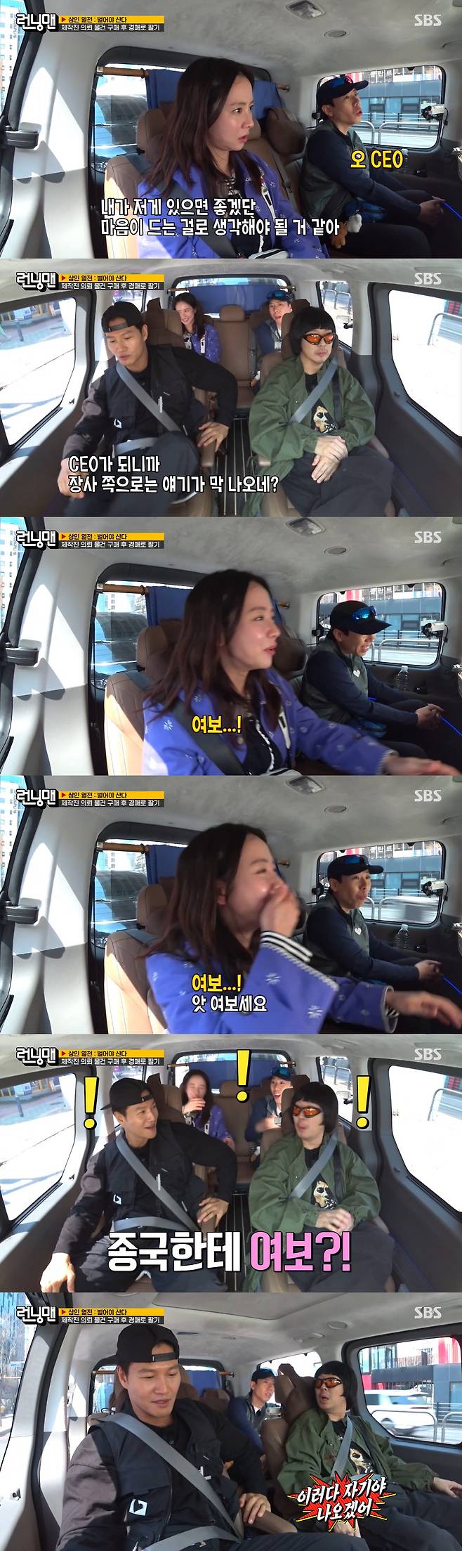 이날 제작진 의뢰 물건 구매 후 경매로 팔기 미션을 진행한 가운데 송지효는 "내가 저게 있으면 좋겠다는 마음이 드는 걸로 생각해야 될 것 같다"고 했다. 이에 김종국은 "CEO 되니까 장사 쪽으로 이야기가 막 나온다"고 했다.
