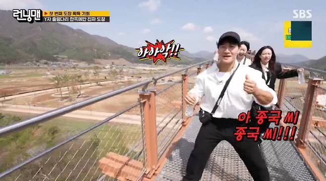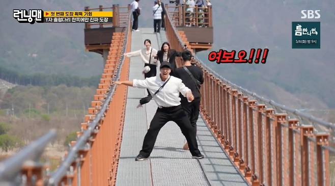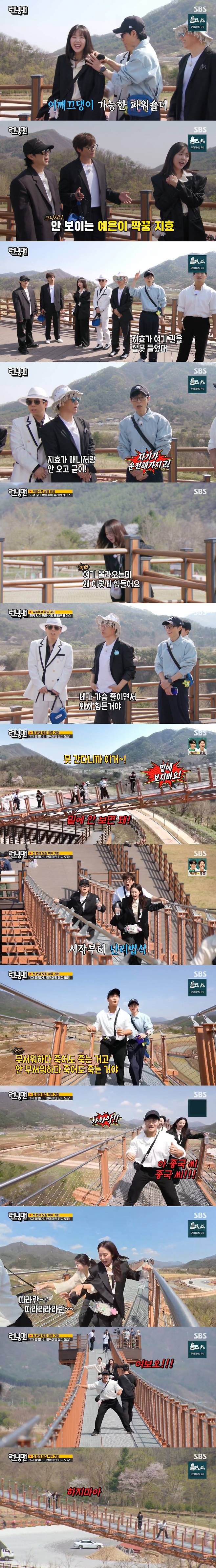 멤버들은 고민 끝에 이동, 바닥 뚫린 것도 잊고 경치에 감탄했다. 그러나 그때 다리가 흔들렸고, 멤버들은 화들짝 놀랐다. 알고보니 김종국이 장난을 친 것. 결국 다리 중간에 갇힌 송지효는 "오빠 하지마라"면서 "여보, 하지 마라"고 외쳐 웃음을 안겼다.
