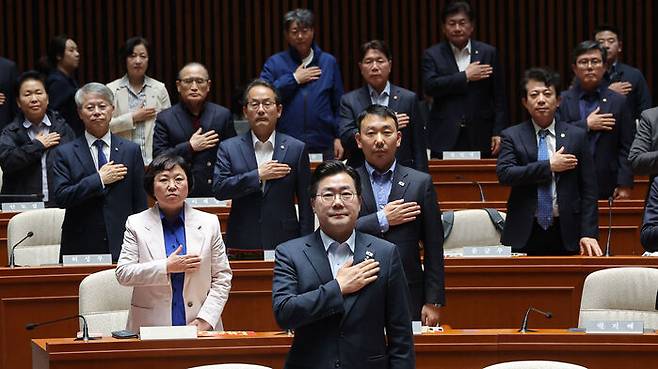 ▲ 더불어민주당 박찬대 원내대표를 비롯한 의원들이 4일 국회에서 열린 긴급 의원총회에서 국기에 경례를 하고 있다.