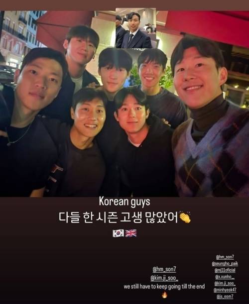손흥민(토트넘 홋스퍼), 김지수(브렌트포드), 배준호(스토크 시티), 양민혁(퀸스파크 레인저스), 백승호, 이명재(이상 버밍엄 시티)와 함께 찍은 사진에 황희찬은 "코리안 가이즈, 다들 한 시즌 고생 많았어"라고 코멘트를 달았다.
