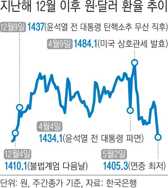 원·달러 환율은 미국의 상호관세가 발효된 지난달 9일 달러당 1487.6원(고가 기준)으로 정점을 찍었다. 지난 4월 한 달간 원·달러 환율의 평균 변동폭과 변동률(주간거래 기준 전일 대비)은 각각 9.7원, 0.67%로 2022년 11월 이후 가장 컸다. 트럼프 정부가 관세 강경 기조에서 한발 물러났고, 미국의 관세 협상이 본격화되며 ‘관세 공포’가 점차 완화된 영향이다.