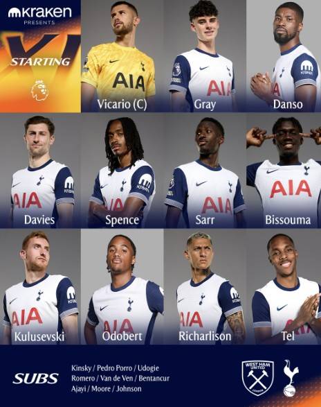 원정팀 토트넘은 4-3-3 포메이션을 가동했다. 굴리엘모 비카리오가 골키퍼 장갑을 착용했다. 제드 스펜스, 벤 데이비스, 케빈 단소, 아치 그레이가 수비 라인을 지킨다. 파페 사르, 이브스 비수마, 데안 클루세브스키가 중원에 나온다. 마티스 텔, 히샬리송, 윌송 오도베르가 공격진을 구성했다.