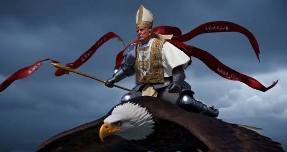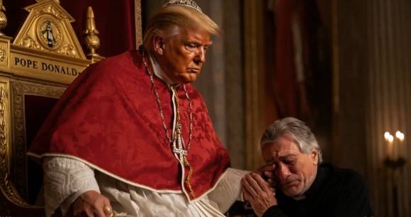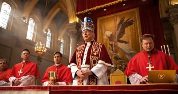 이 영상은 트럼프가 교황 복장을 하고 퇴마 의식을 행하거나 거대 독수리를 타는 모습이 담겨 있고, 일론 머스크가 추기경으로 등장하며, 트럼프 비판자인 로버트 드 니로가 교황의 반지에 입 맞추는 장면까지 포함돼 ‘신성모독’이라는 비판이 쏟아지고 있다.