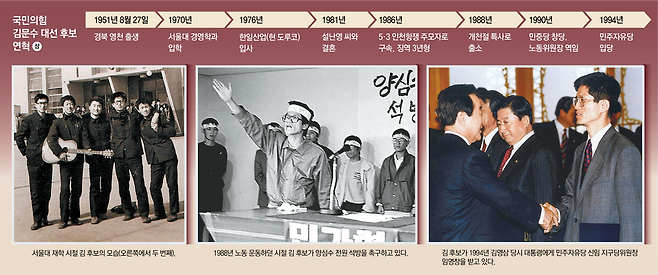 김 후보는 2년 뒤인 1994년 3월 “지금 여당이 개혁을 잘하고 있고 가장 개혁적인 정치인이 김영삼 대통령”이라며 당시 여당인 민주자유당에 전격 입당한다. 김 후보의 서울대 은사인 안병직 명예교수는 “우리가 운동할 때 가졌던 휴머니즘을 현실에 제대로 접목해 실현할 방법을 찾아야 할 것”이라며 입당에 찬성했다고 한다.
