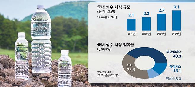 4일 시장조사기관 유로모니터에 따르면 2024년 국내 생수 시장 규모는 전년(2조7483억원) 대비 15.6% 확대된 3조1761억원으로 사상 최대치를 기록했다. 학교나 단체 등에 대규모 납품되는 생수를 제외하고, 일반 소비자가 마트나 편의점, 이커머스 등에서 구매한 것만 집계한 수치다.