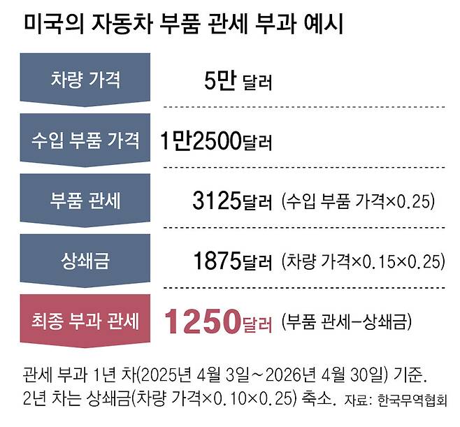 미국 정부도 부품 관세의 파급력을 인지하고 부품 관세를 일부 완화하기로 했다. 수입차 관세가 발효된 4월 3일부터 내년 4월 30일까지는 미국에서 조립한 자동차 가격의 15%에 해당하는 부품 관세를 면제하고, 내년 5월 1일부터 2027년 4월 30일까지는 면제율을 차 가격의 10%로 소폭 줄이겠다는 것이다. 가령 5만 달러짜리 자동차에 쓰인 수입 부품이 1만2500달러라면 본래 부과될 부품 관세는 총 3125달러여야 하지만 1년 차에는 1250달러, 2년 차에는 1875달러만 부과하는 셈이다.