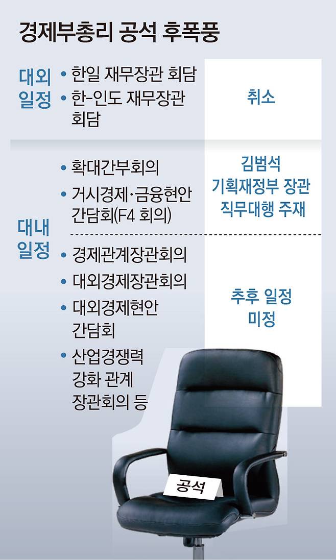 경제부총리 공백으로 경제 부처 간 정책 조율 기능도 흔들리는 분위기다. 2일 김 직무대행이 대행 첫 일정으로 거시경제·금융현안간담회(F4 회의)를 주재했지만 F4 리더십이 약화될 수 있다는 우려가 나온다.