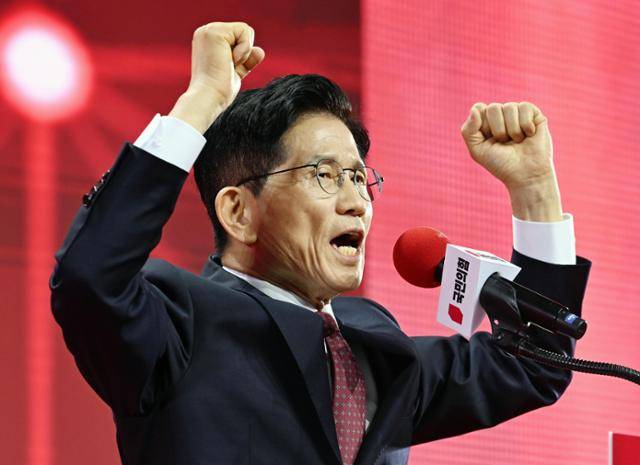 김문수 국민의힘 대선 후보가 3일 선출 직후 수락연설을 하며 두 주먹을 치켜들고 있다. 김 후보는 경기 일산 킨텍스에서 열린 전당대회에서 득표율 56.53%로 한동훈 전 대표를 꺾고 국민의힘 경선의 최종 승자가 됐다. 고양=하상윤 기자